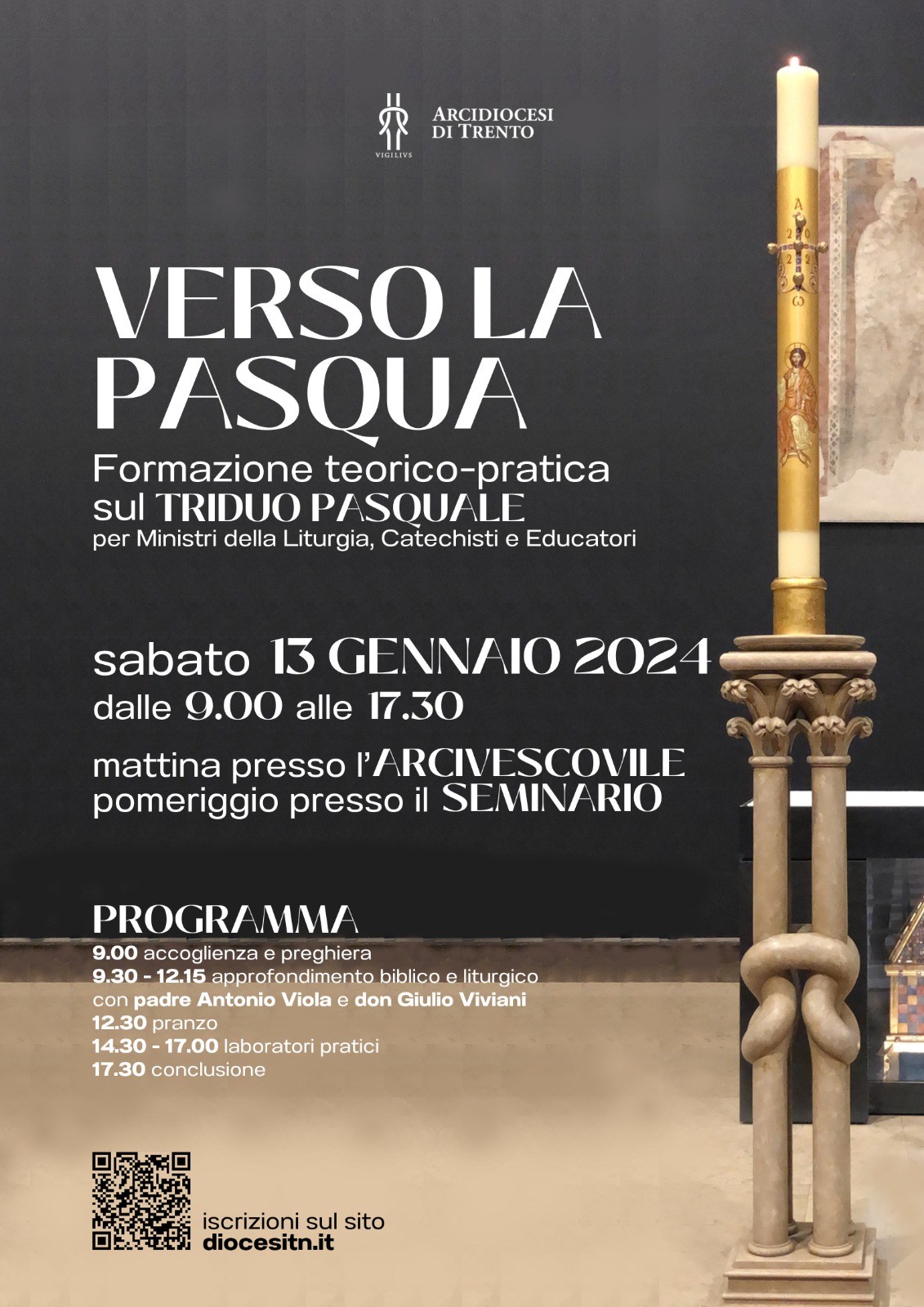 - al mattino (Teatro arcivescovile, via Endrici a Trento) a partire dalle ore 9.00 due relazioni, una biblica con p. Antonio Viola e una liturgico-pastorale con d. Giulio Viviani.
