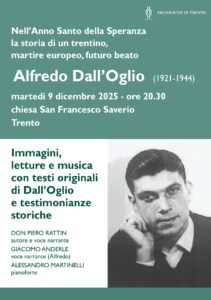 Approda martedì 9 dicembre a Trento, nella chiesa di San Francesco Saverio alle ore 20.30 il recital dedicato alla riscoperta del futuro beato trentino Alfredo Dall’Oglio, nato a Borgo Valsugana, emigrato a tre anni con la famiglia a Parigi, e morto nel 1944 a soli 23 anni nel lager di Wuhlheide, vicino a Berlino, vittima dell’odio alla fede.