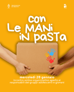 Mercoledì 28 gennaio alle ore 20.30 si è tenuto un incontro formativo online rivolto ai referenti e ai responsabili dei gruppi che intendono partecipare a Con le mani in pasta, la raccolta di viveri e beni di prima necessità organizzata dai gruppi adolescenti della Diocesi in collaborazione con Caritas, in programma sabato 11 aprile.