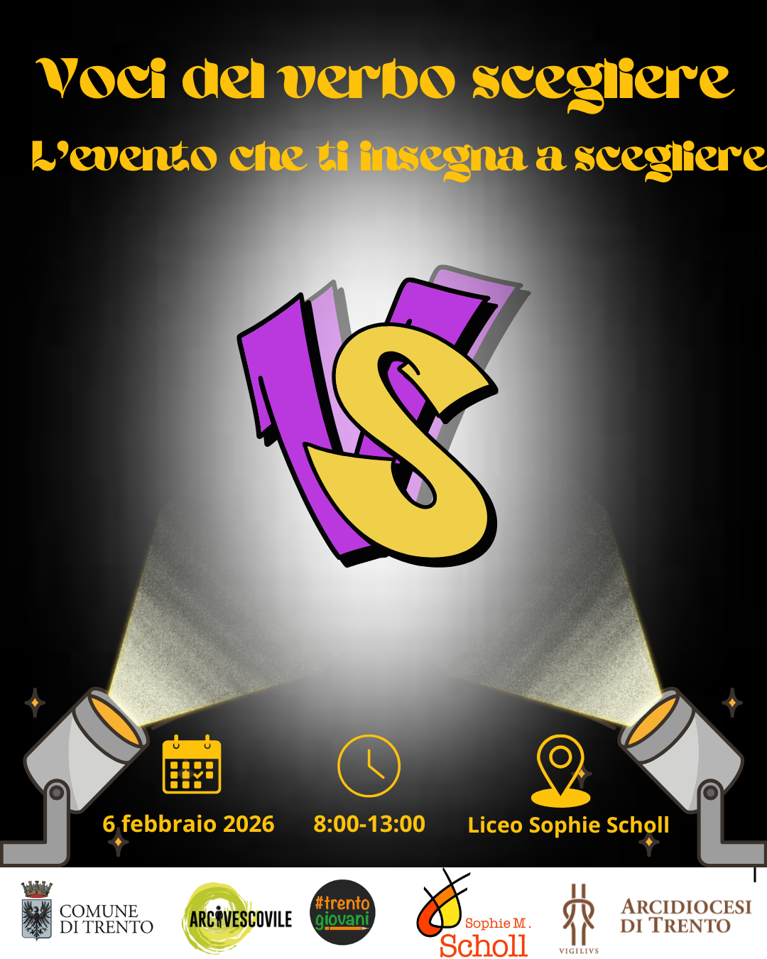 Voci del verbo scegliere, l’evento per i maturandi delle scuole di Trento, con al centro la domanda: «Come si fa a scegliere?», si terrà venerdì 6 febbraio 2026 presso la scuola superiore “Sophie Scholl” a Trento.