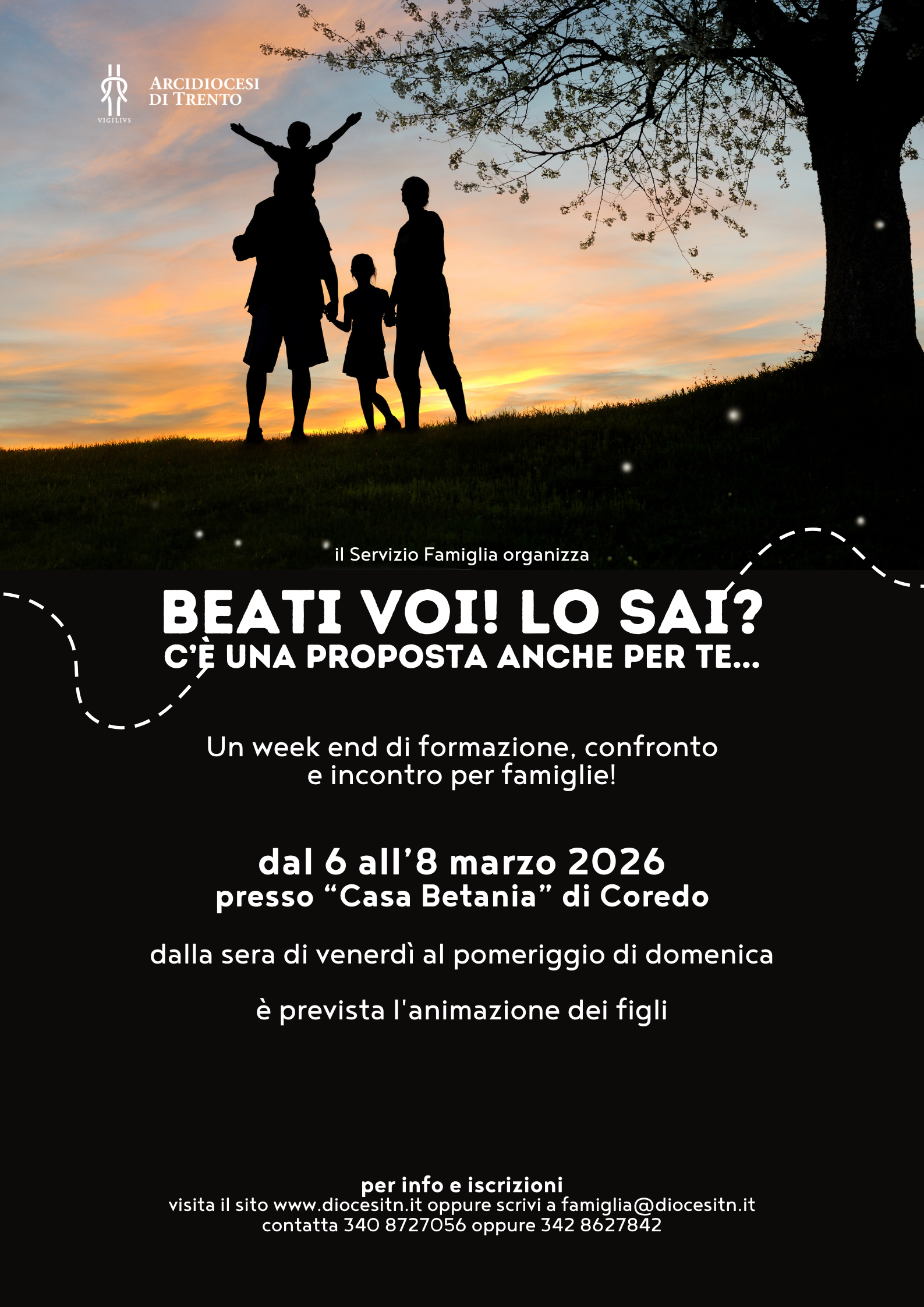 Il Servizio Famiglia propone un fine settimana di esercizi spirituali per famiglie guidati da un sacerdote e una coppia di sposi dalla sera di venerdì 6 al pomeriggio di domenica 8 marzo 2026 presso “Casa Betania” di Coredo.