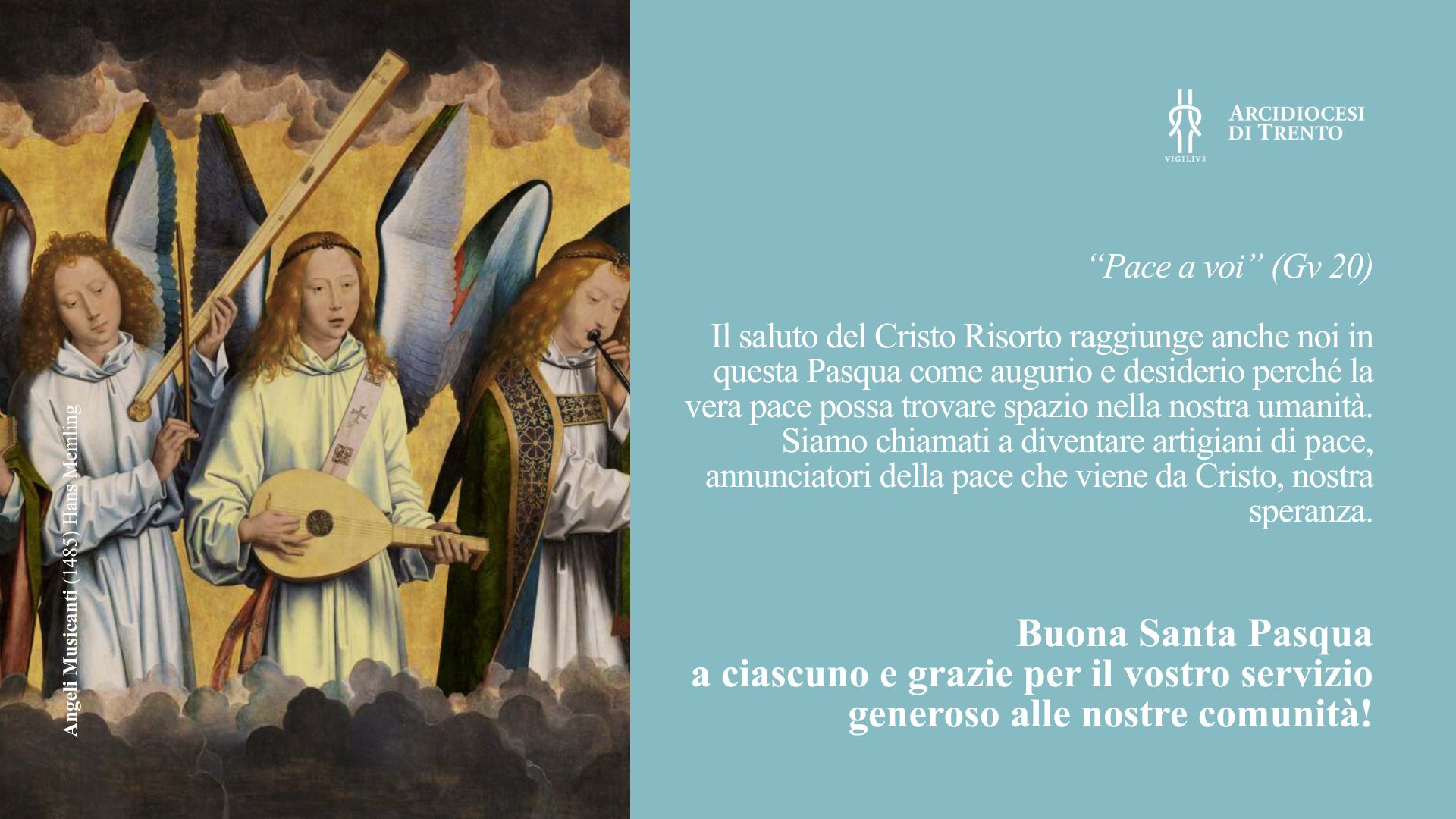 La Pasqua ci ricorda che persino l’ora più oscura della passione e della morte è vinta dalla luce nuova e sfolgorante della risurrezione. Che il saluto di Gesù trovi cuori attenti e disponibili, così da credere e testimoniare la pace autentica che solo il Risorto dona.
