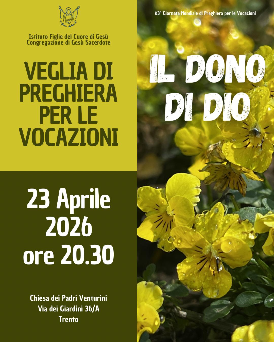 - Il dono di Dio – veglia di preghiera presso la chiesa dei Padri Venturini a Trento – giovedì 23 aprile ore 20.30 – qui la locandina