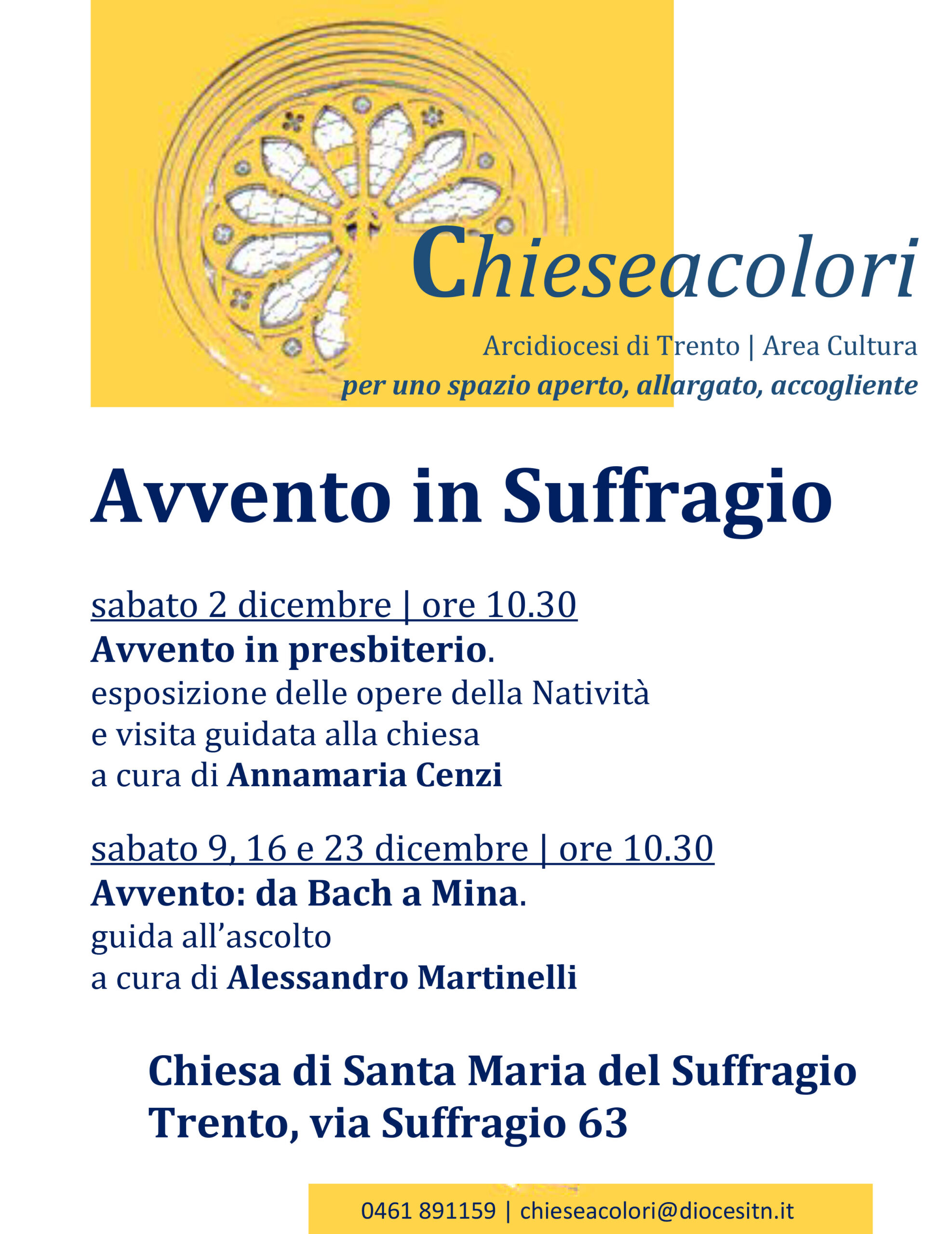 Nella Chiesa di santa Maria del Suffragio, nell’omonima via di Trento, saranno esposte al pubblico tre tele settecentesche sul tema del Natale, accompagnate, alle 10.30 di ogni sabato, dall’ascolto di un percorso musicale sul senso dell’attesa.