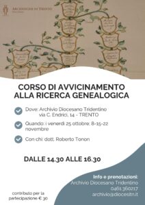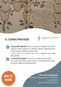 L’Archivio Diocesano Tridentino organizza un corso di avvicinamento alla ricerca genealogica. I destinatari (massimo 12 iscritti) sono le persone interessate alla ricostruzione delle proprie origini, che si accostano per la prima volta alle ricerche nei registri parrocchiali.
