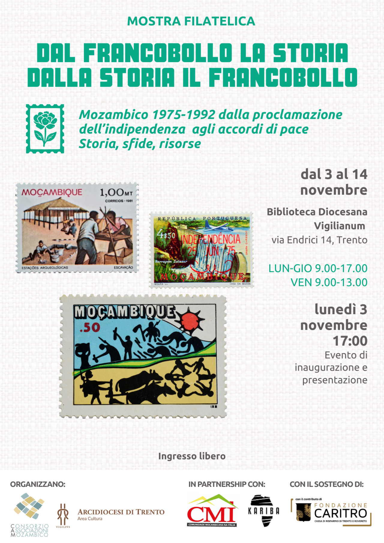 Da lunedì 3 a venerdì 14 novembre il CAM-Consorzio Associazioni Mozambico, in collaborazione con la Biblioteca diocesana Vigilianum, presenta la mostra filatelica Dal Francobollo la Storia, dalla Storia il Francobollo: Mozambico 1975-1992 dalla proclamazione dell’indipendenza agli accordi di pace. Storia, sfide, risorse”. La mostra fa parte della rassegna “Africa Plurale”, curata dal CAM, che propone dall’1 ottobre al 21 novembre due mesi ricchi di eventi a Trento per raccontare l’Africa e il Mozambico da tanti diversi punti di vista, con ospiti, mostre, musica, cucina e danza.