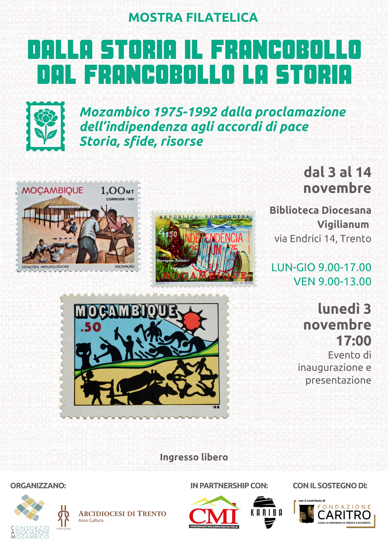 Da lunedì 3 a venerdì 14 novembre il CAM-Consorzio Associazioni Mozambico, in collaborazione con la Biblioteca diocesana Vigilianum, presenta la mostra filatelica “Dalla storia il francobollo, dal francobollo la storia: Mozambico 1975-1992 dalla proclamazione dell’indipendenza agli accordi di pace. Storia, sfide, risorse”. La mostra fa parte della rassegna “Africa Plurale”, curata dal CAM, che propone dall’1 ottobre al 21 novembre due mesi ricchi di eventi a Trento per raccontare l’Africa e il Mozambico da tanti diversi punti di vista, con ospiti, mostre, musica, cucina e danza.