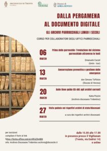 Con il corso “Dalla pergamena al documento digitale. Gli archivi parrocchiali lungo i secoli” per la prima volta gli archivi delle diocesi di Trento, Verona e Adria-Rovigo hanno messo insieme necessità e competenze per l’organizzazione di un  corso rivolto ai collaboratori degli archivi parrocchiali, al fine di valorizzare il loro lavoro a fianco dei parroci ed aiutarli a conservare al meglio le memorie storiche delle comunità locali, oltre ad avere gli strumenti per poter organizzare al meglio la documentazione corrente, ovvero la memoria di domani. Tale iniziativa non ha una finalità di formazione professionale ed è offerta gratuitamente.