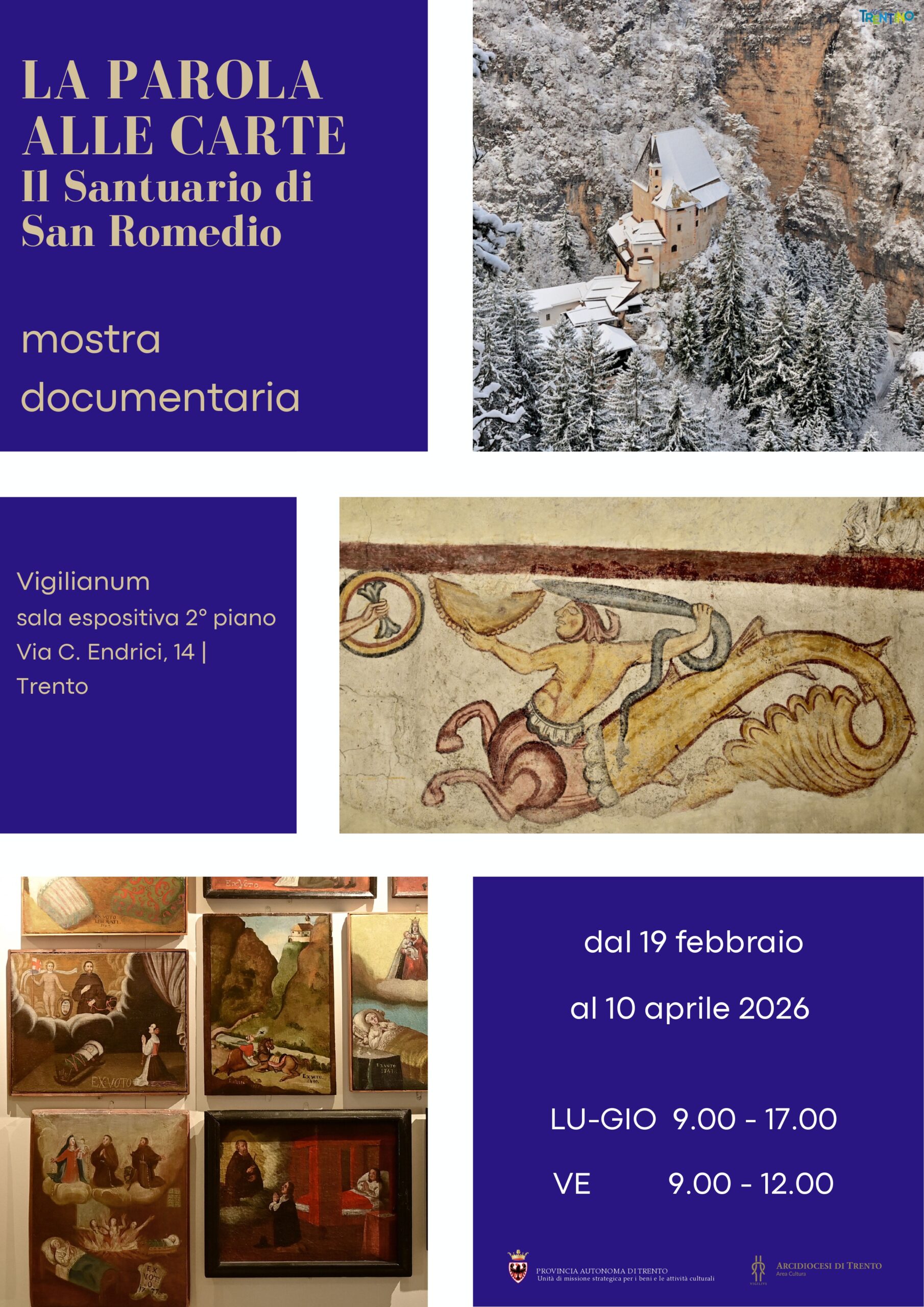 L’Archivio Diocesano, in collaborazione con l’Umst per i beni e le attività culturali, propone tre visite guidate alla mostra documentaria “La parola alle carte. Il Santuario di San Romedio”, visitabile fino al 10 aprile presso la sala espositiva al secondo piano del Vigilianum. La mostra raccoglie documentazione storica dal 1478 al XX sec., proveniente dall’archivio del santuario e dall’Archivio Diocesano. Sono inoltre esposte alcune fotografie. Le visite saranno tenute da Emanuela Rollandini e Salvatore Ferrari, curatori del volume “Il santuario di San Romedio”, recentemente presentato al Vigilianum.