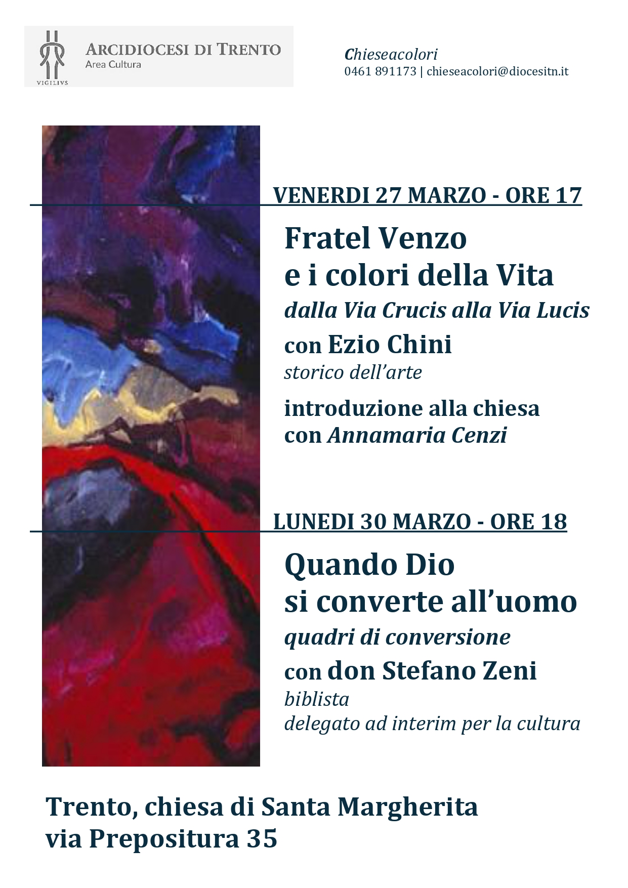 La chiusura dell’esposizione della Via Crucis sarà quindi affidata alla voce di don Stefano Zeni, biblista e delegato ad interim per la cultura, con la riflessione biblica di lunedì 30 marzo alle ore 18, sempre in Santa Margherita: un appuntamento d’augurio pasquale per tutte le amiche e gli amici di Chieseacolori.