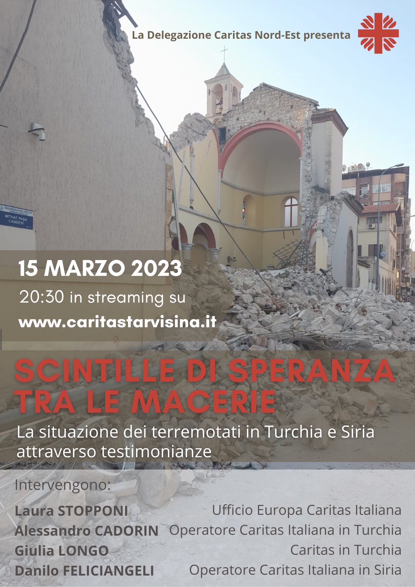 Mercoledรฌ 15 marzo alle ore 20:30, le Caritas della Delegazione Nord-Est (Friuli Venezia Giulia, Trentino Alto Adige e Veneto) organizzano lโincontro online โ๐๐ค๐ช๐ฏ๐ต๐ช๐ญ๐ญ๐ฆ ๐ฅ๐ช ๐ด๐ฑ๐ฆ๐ณ๐ข๐ฏ๐ป๐ข ๐ต๐ณ๐ข ๐ญ๐ฆ ๐ฎ๐ข๐ค๐ฆ๐ณ๐ช๐ฆโ, un momento di riflessione e testimonianza sulla situazione drammatica dei terremotati in Turchia e Siria; sarร anche l’occasione per conoscere le iniziative programmate per affrontare lโemergenza,ย quali sono le necessitร e le criticitร e come sostenere le attivitร in corso.