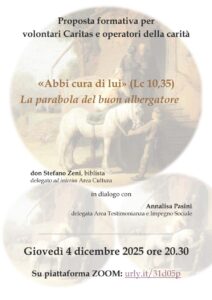 Giovedì 4 dicembre 2025, alle ore 20.30, si terrà un incontro online dedicato ad approfondire il tema «Abbi cura di lui», tratto dal passo evangelico del Buon Samaritano, con un’attenzione particolare alla figura – spesso trascurata – del buon albergatore.