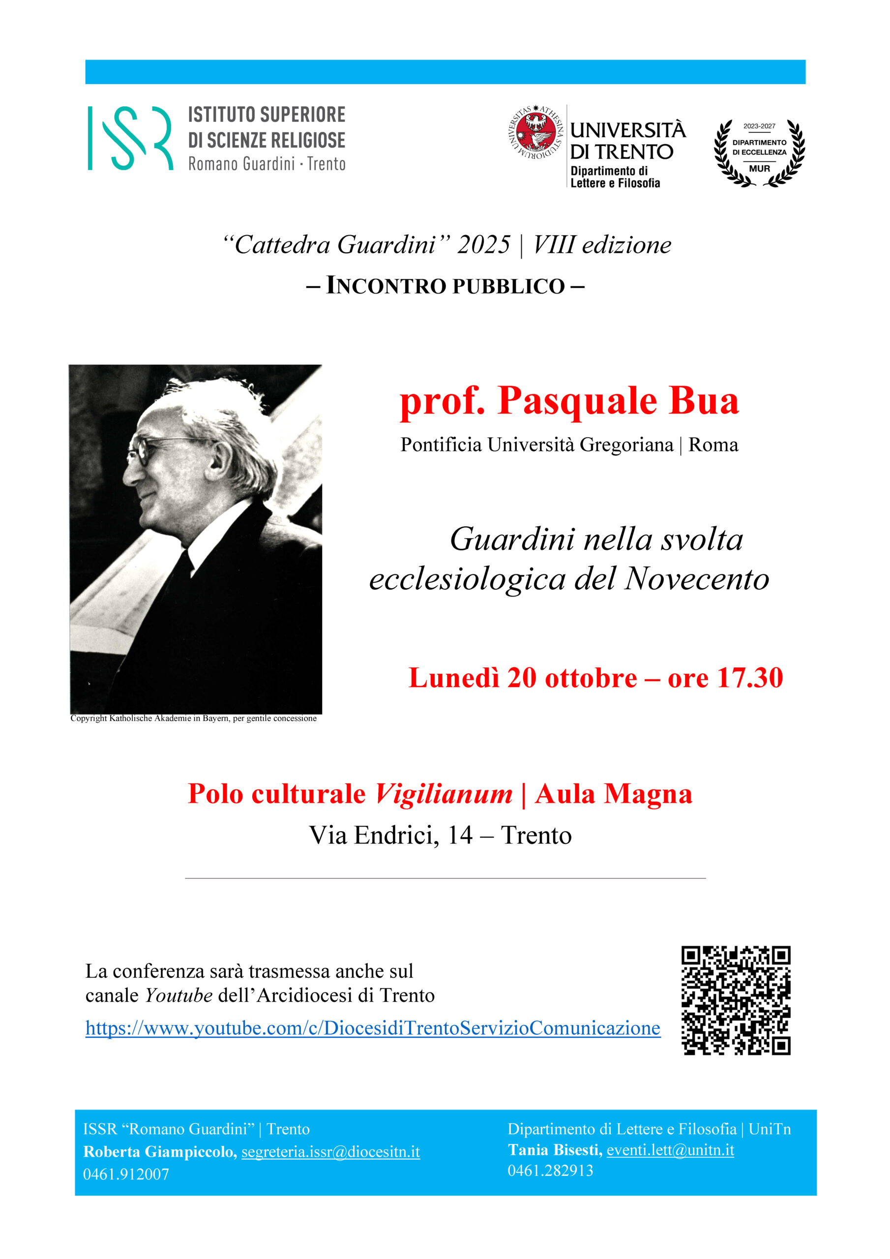 Il giorno successivo, martedì 21 ottobre alle ore 9.30, il prof. Bua terrà un Seminario di Alta Formazione, riservato a docenti e dottorandi, sul tema “Comunità, modernità, autorità: temi interdisciplinari in Romano Guardini a partire dalla sua ecclesiologia”.