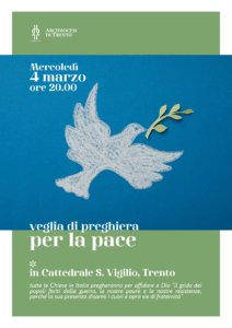 Anche la Diocesi di Trento aderisce all’iniziativa di preghiera per la pace promossa dalla Chiesa italiana per mercoledì 4 marzo, in unità con il Consiglio delle Conferenze Episcopali d’Europa (CCEE). Obiettivo: pregare per le vittime della guerra e invocare una pace “disarmata e disarmante” in Ucraina, nell’infuocato Medio Oriente e in tutto il mondo.