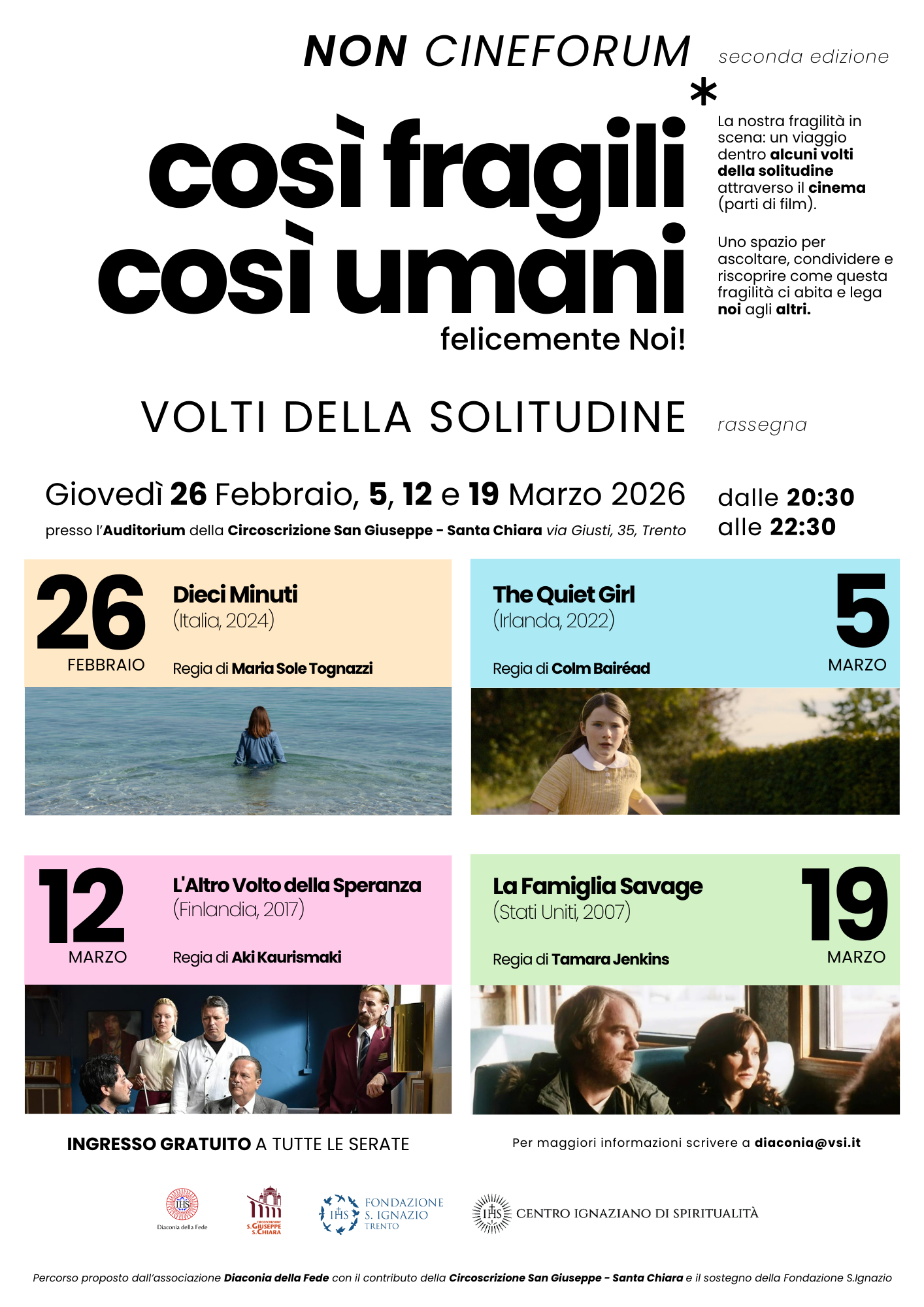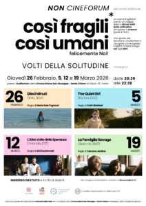 L’iniziativa propone un percorso originale – definito “non cineforum” – che utilizza il linguaggio del cinema come punto di partenza per ascoltare, condividere e riflettere sulla fragilità umana e sulle forme di solitudine che attraversano la vita contemporanea. Attraverso la visione di sequenze filmiche e momenti di confronto guidato, i partecipanti saranno invitati a riconoscere come la fragilità possa diventare un luogo di relazione e una risorsa per costruire legami più autentici.