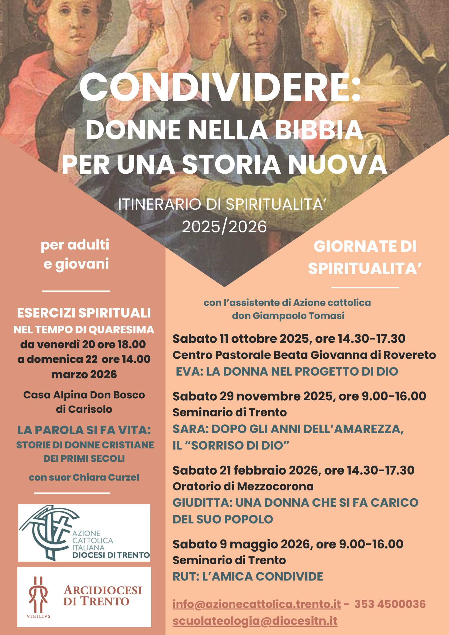 L’Azione cattolica del Trentino e Scuola Diocesana di Formazione Teologica ripropongono anche per l’anno pastorale 2025/2026 un itinerario di spiritualità per adulti e giovani, aperto a tutti gli interessati. Le meditazioni riguarderanno alcune figure femminili nella Bibbia, per evidenziarne il cammino di fede, l’originalità e lo stile materno di testimonianza e servizio, in tutta la loro attualità anche per i cristiani di oggi.