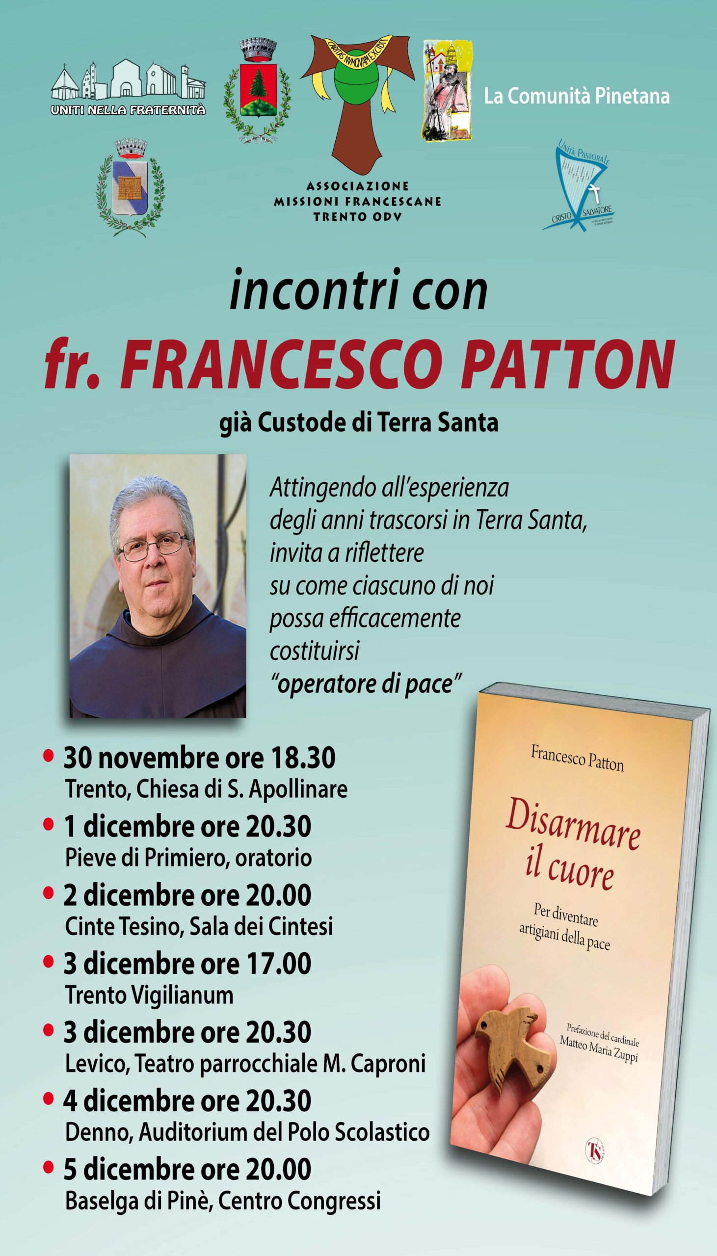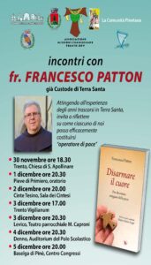 Fra Francesco Patton, Custode di Terra Santa fino allo scorso giugno, girerà il Trentino dal 30 novembre a 5 dicembre per presentare il suo libro “Disarmare il cuore. Per diventare artigiani di pace“.