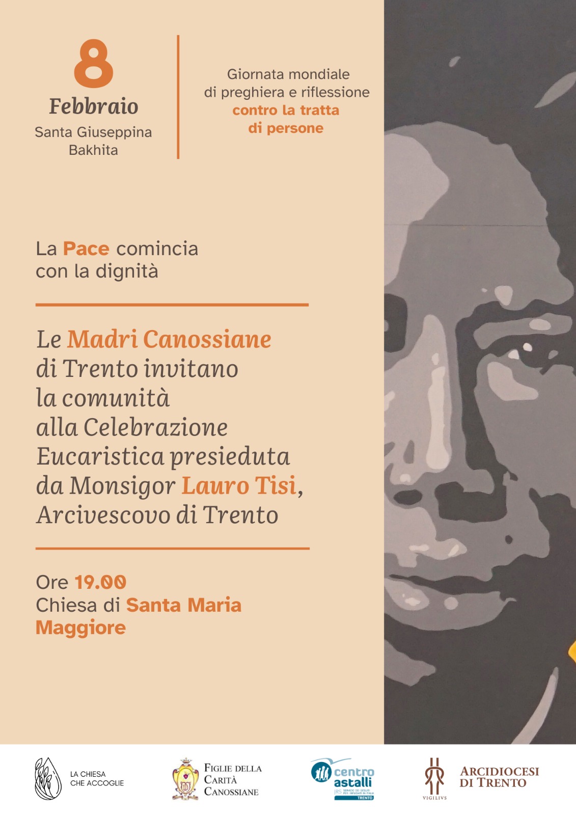Nella ricorrenza di Santa Giuseppina Bakhita, giornata internazionale di preghiera e riflessione contro la tratta di persone, a Trento si tiene domenica 8 febbraio alle 19 la Santa Messa nella chiesa di Santa Maria Maggiore per iniziativa delle Figlie della Carità Canossiane, del Centro Astalli e dell’Arcidiocesi.