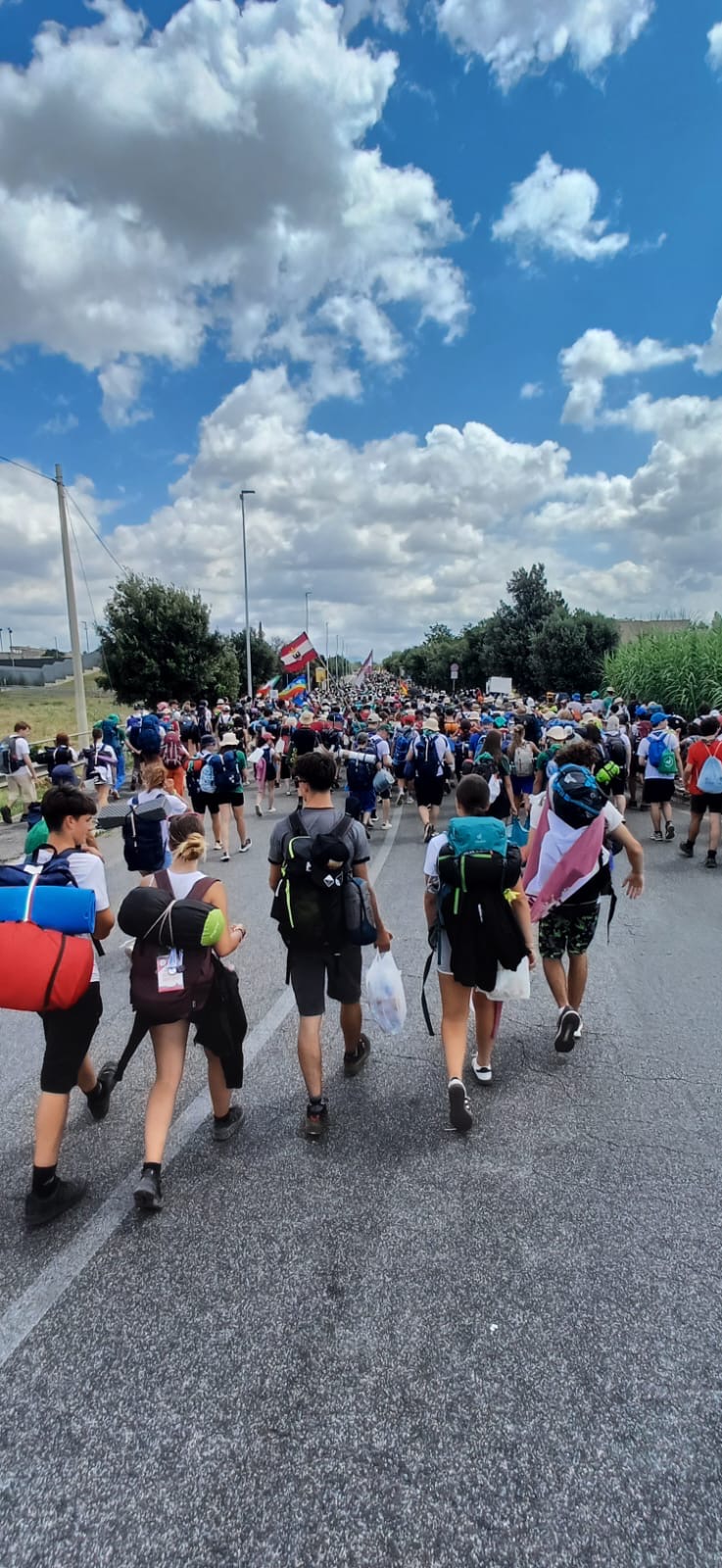 Terminata la Catechesi, zaini in spalla direzione Tor Vergata. Circa 10 chilometri di cammino, alleggeriti dalla graditissima presenza dei volontari della Protezione civile (tra cui molti trentini) a consegnare acqua, succhi, borracce e snack per il viaggio.