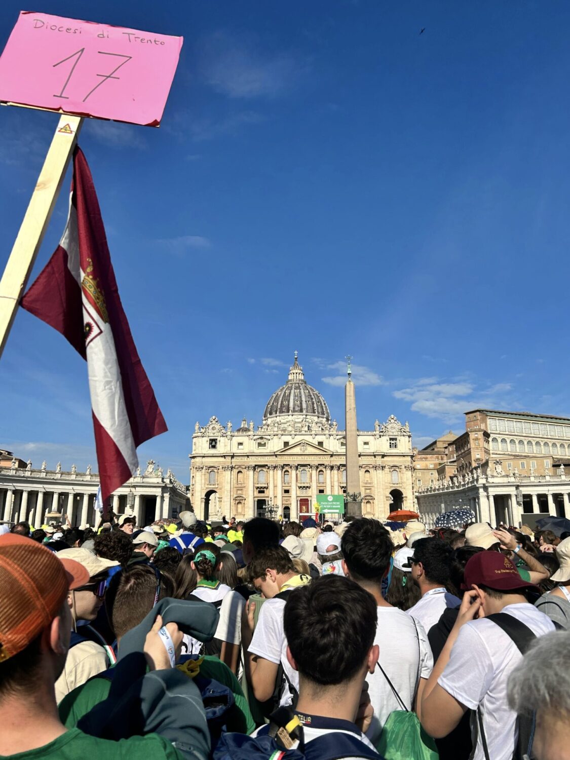In questa ultima giornata di pellegrinaggio i ragazzi e le ragazze si sono incamminati già dalle 6.00 verso San Pietro per partecipare alla Messa. Dopo un “lungo” viaggio accompagnati da altre decine di migliaia di adolescenti provenienti da tutto il mondo, i giovani trentini sono arrivati nelle vicinanze di San Pietro. I più fortunati sono arrivati in Piazza, gli altri si sono sparpagliati nelle vicinanze per seguire la messa dai maxi schermo montati.