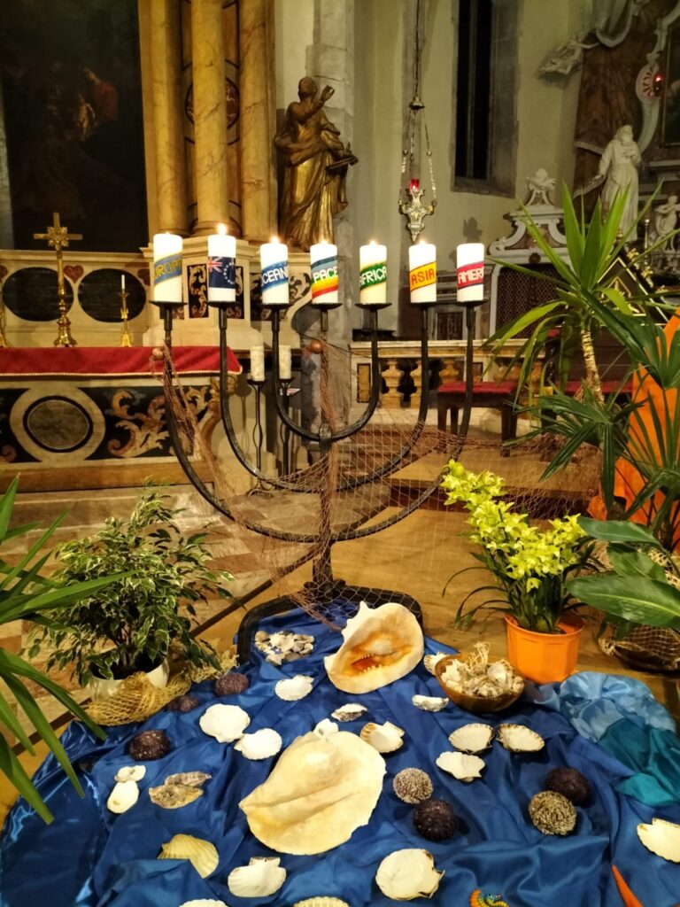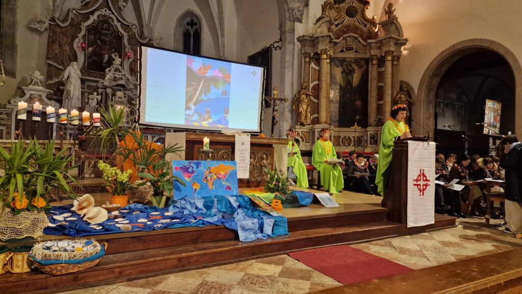 Le protagoniste della preghiera di Sanzeno si sono vestite con colori vivaci e collane di fiori per ricordare le donne delle Isole Cook. Una meravigliosa coreografia ha trasformato il presbiterio, restituendo gioia e bellezza per gli occhi e il cuore.