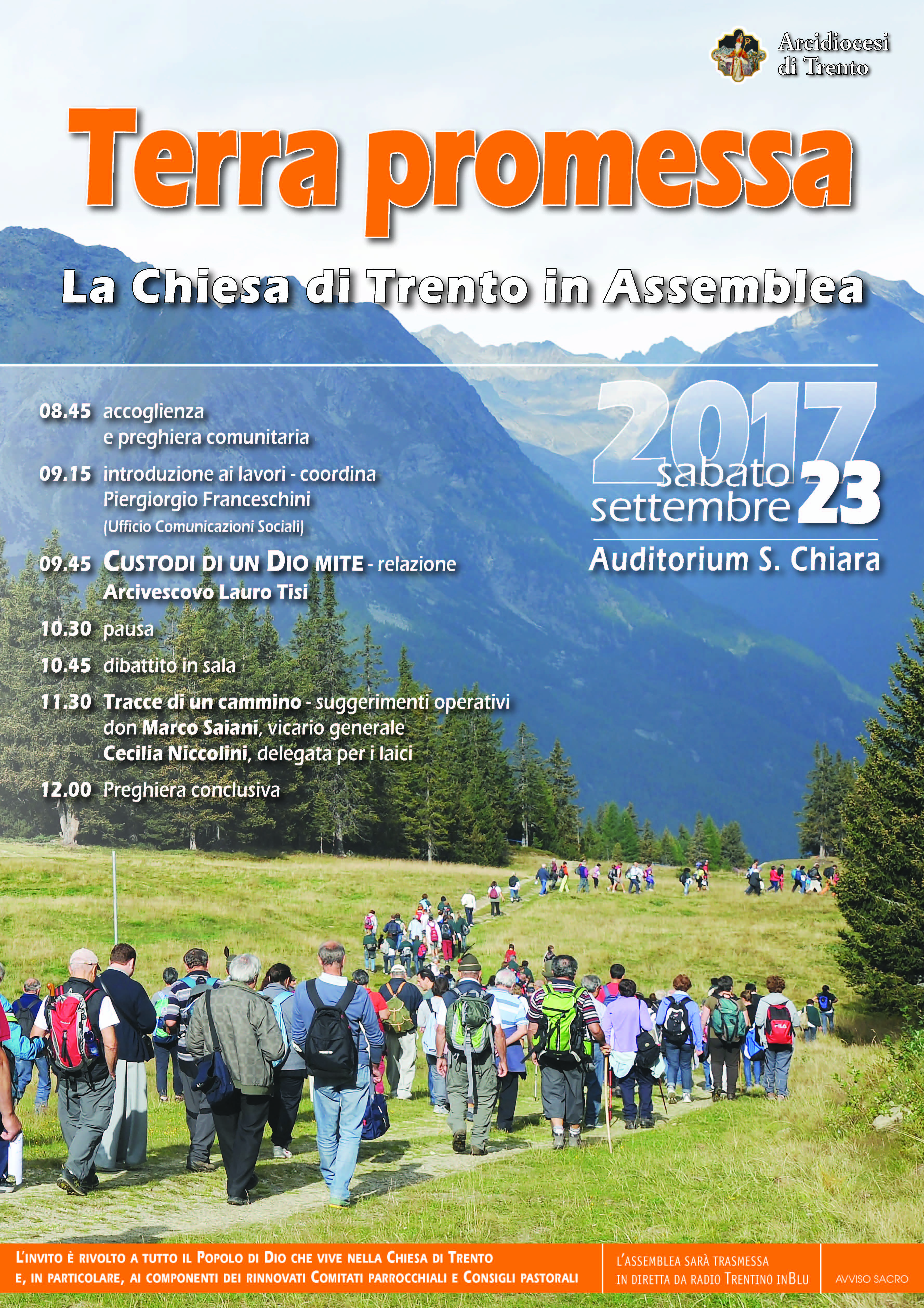 Il titolo “Terra promessa” e la foto di un popolo in cammino. Una sorta di Esodo contemporaneo è l'”icona” che accompagna l’assemblea diocesana di sabato 23 settembre, tradizionale inizio dell’anno pastorale. L’appuntamento è dalle ore 8.45 alle 12 presso l’Auditorium S. Chiara di Trento. Ai lavori, introdotti da Piergiorgio Franceschini (Ufficio Comunicazioni), sono invitati quest’anno, in particolare, i componenti dei comitati parrocchiali e dei consigli pastorali. L’Arcivescovo Lauro rifletterà sul tema “Custodi di un Dio mite”, preludio al dibattito in sala e ai suggerimenti operativi a cura del vicario generale don Marco Saiani e della delegata per i laici Cecilia Niccolini. Diretta su radio Trentino inBlu.