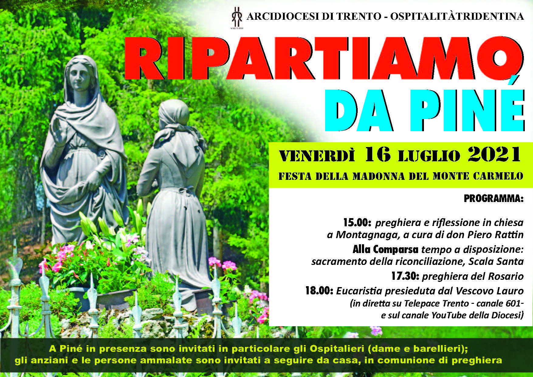 In occasione della festa della Madonna del Monte Carmelo, il programma prevede al prato della Comparsa alle 15 la preghiera e la riflessione di don Piero Rattin, rettore del santuario, in chiesa a Montagnaga; al prato della Comparsa ci sarà poi del tempo per avvicinarsi al sacramento della riconciliazione o per meditare lungo la Scala Santa.