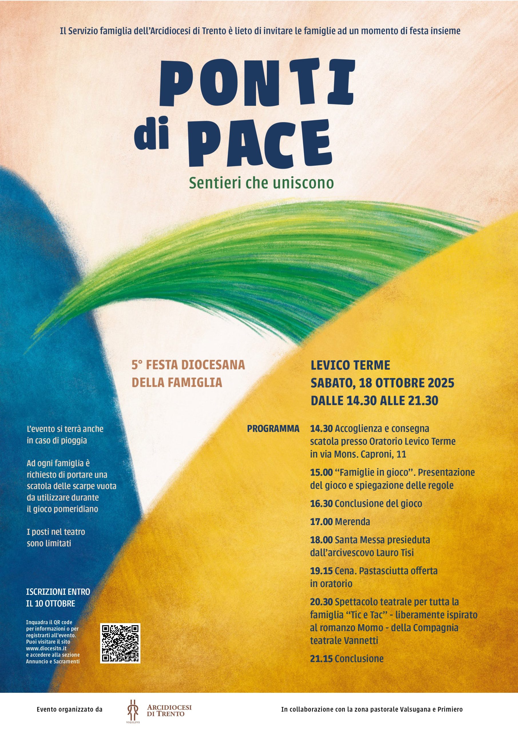 Un pomeriggio di incontro, gioco e spiritualità per tutte le famiglie. Sabato 18 ottobre 2025, a Levico Terme, torna la Festa diocesana della famiglia, organizzata dal Servizio famiglia dell’Arcidiocesi di Trento in collaborazione con la Zona pastorale Valsugana e Primiero. L’appuntamento si inserisce di fatto anche nel programma della Visita pastorale dell’arcivescovo Lauro alle parrocchie dell’alta Valsugana.
