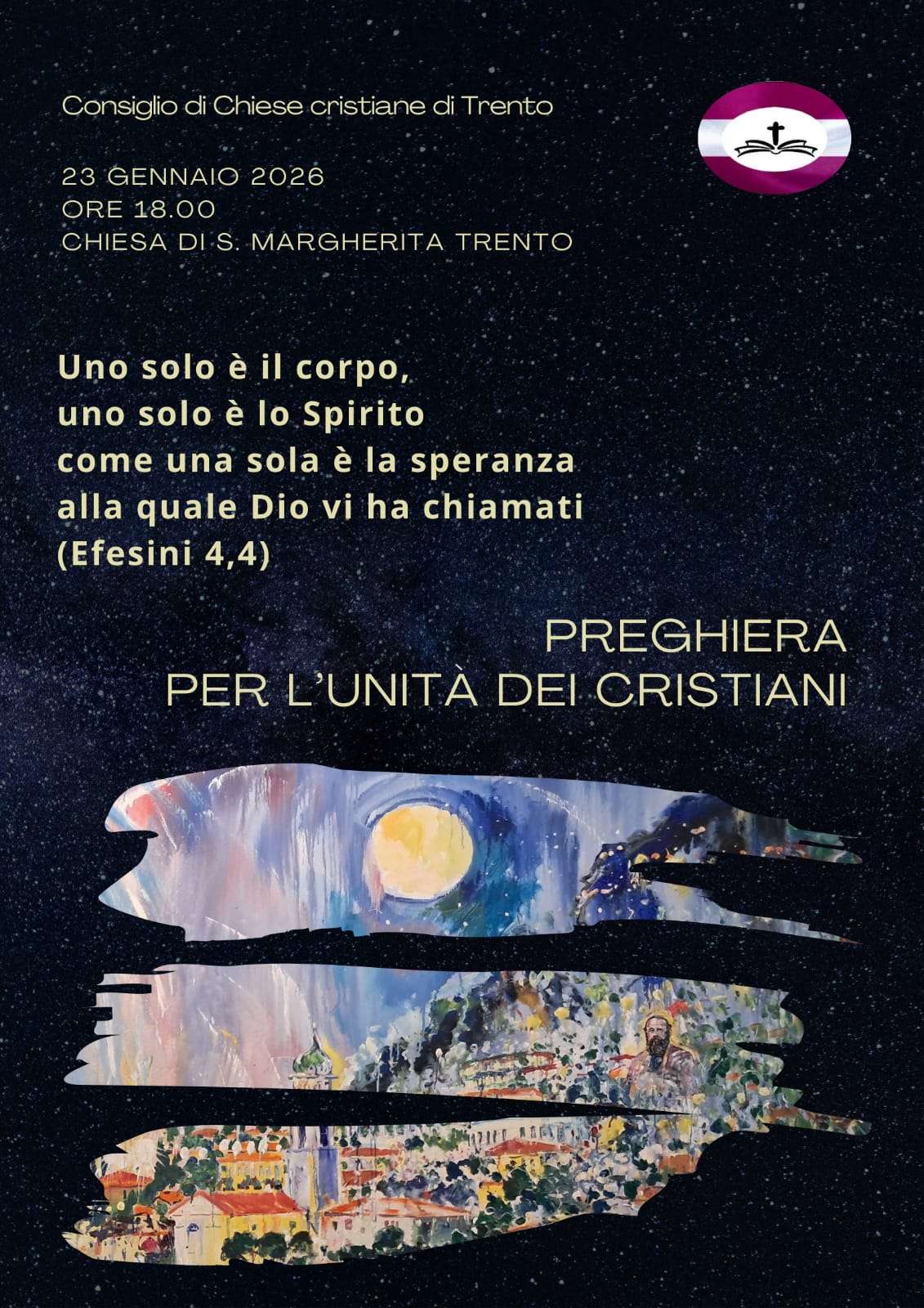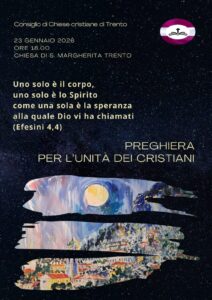 Anche la Diocesi di Trento vivrà la Settimana di Preghiera con momenti di incontro e di preghiera condivisa. In particolare, venerdì 23 gennaio 2026, alle ore 18.00, presso la chiesa di Santa Margherita a Trento, si terrà la Preghiera ecumenica per l’unità dei cristiani, promossa dal Consiglio di Chiese Cristiane di Trento e aperta a tutte e a tutti.