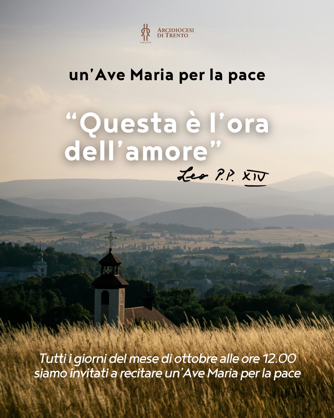 La Chiesa trentina invita le comunità e i singoli a rivolgere ogni giorno alle ore 12 un’Ave Maria per la pace. “Questa è l’ora dell’amore” è la frase del Papa che accompagna la proposta diocesana di raccogliersi per un momento della propria giornata ed esprimere un’invocazione di pace.