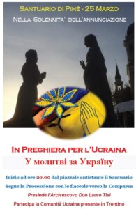 A Montagnaga alle ore 20, dal piazzale antistante al santuario, partirà la processione con le fiaccole fino alla Comparsa. Alla preghiera, guidata dall’arcivescovo Lauro è invitata anche la comunità ucraina presente in Trentino; al santuario mariano, accanto all’arcivescovo Lauro (così come accaduto nelle due recenti veglie per la pace in cattedrale) sarà presente anche padre Augustin Babiak, della Chiesa greco-cattolica ucraina.