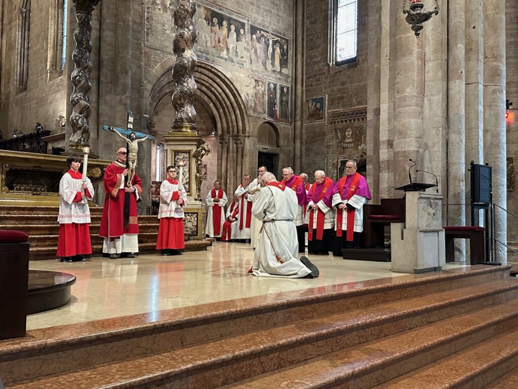 Nel silenzio intenso del Venerdì Santo, nella cattedrale di San Vigilio gremita di fedeli l’arcivescovo di Trento Lauro Tisi ha presieduto nel pomeriggio la celebrazione della Passione del Signore, con il rito dell’adorazione della Croce. Alle ore 20.30 l’Arcivescovo guida la Via Crucis nella Basilica di Santa Maria Maggiore.