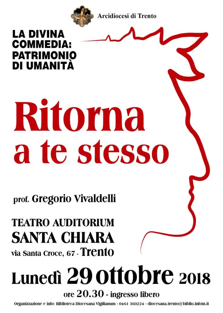 Al teatro auditorium Santa Chiara di Trento, il prof. Gregorio Vivaldelli nella serata dal titolo “Ritorna a te stesso, la Divina Commedia patrimonio di umanità”. Ingresso libero.