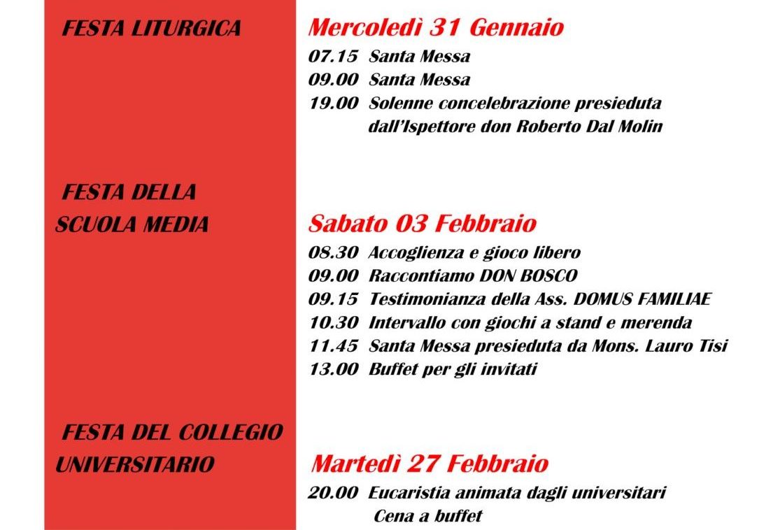 Programma 2018 della festa di San Giovanni Bosco presso l’Istituto Salesiano Maria Ausiliatrice (Trento)