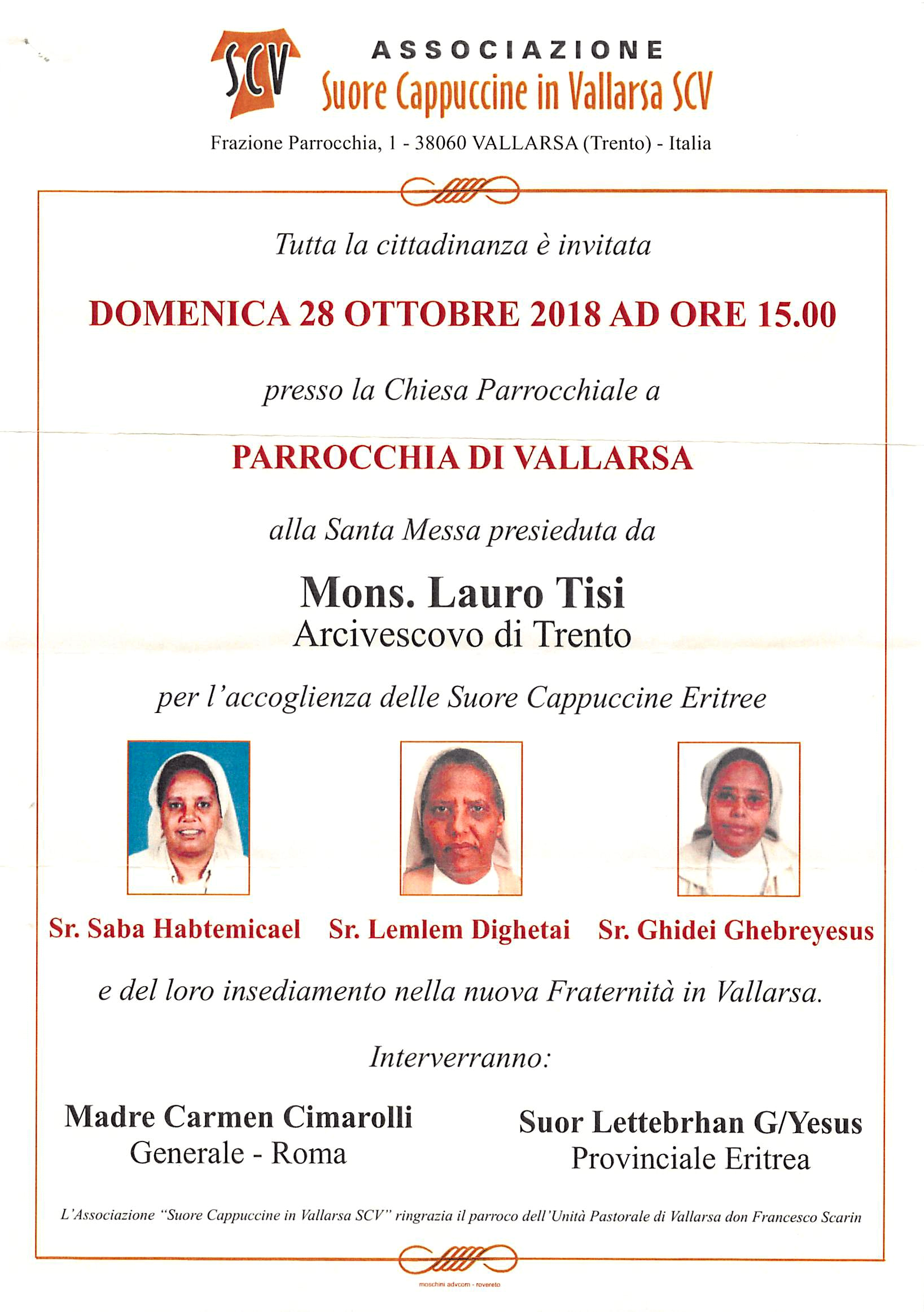 Tutta la cittadinanza è invitata domenica 28 ottobre 2018 ad ore 15.00 presso la Chiesa Parrocchiale a Parrocchia di Vallarsa alla Santa Messa presieduta da Monsignor Lauro Tisi, Arcivescovo di Trento, per l’accoglienza delle Suore Cappuccine Eritree (Sr. Saba Habtemicael – Sr. Lemlem Dighetai – Sr. Ghidei Ghebreyesus) e del loro insediamento nella nuova Fraternità in Vallarsa.
